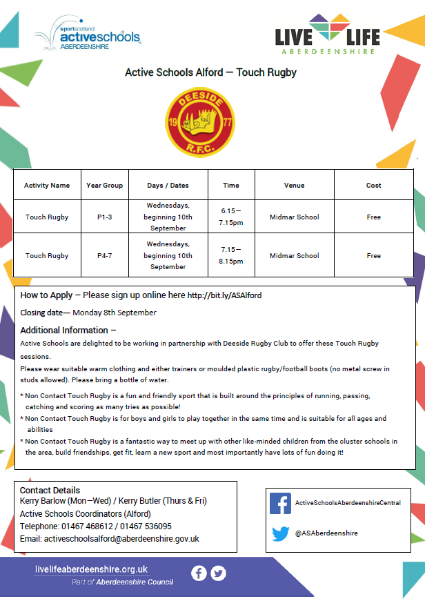 We are looking for more people to help with the coaching so if you would be interested please contact activeschoolsalford@aberdeenshire.gov.uk or call 01467 468612 and we can have a chat.